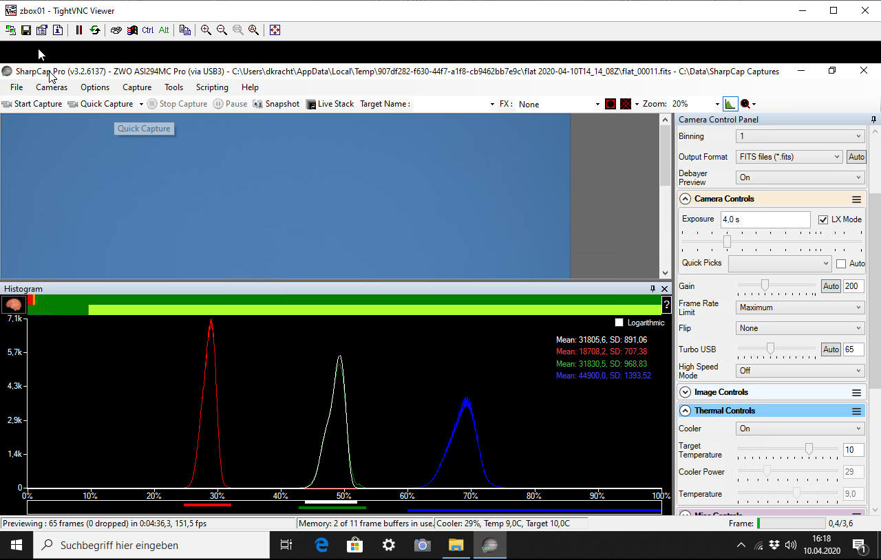 Da bin ich also mit dem Mittelwert bei 31805.6 ADU, was so ungefähr den Empfehlungen entspricht. Manche Experten halten das schon zu hell und meinen 28000 oder 25000 ADU wären besser. Die Software SharpCap meckert aber, wenn auch nur ein kleines bisschen unter 20% sinkt.