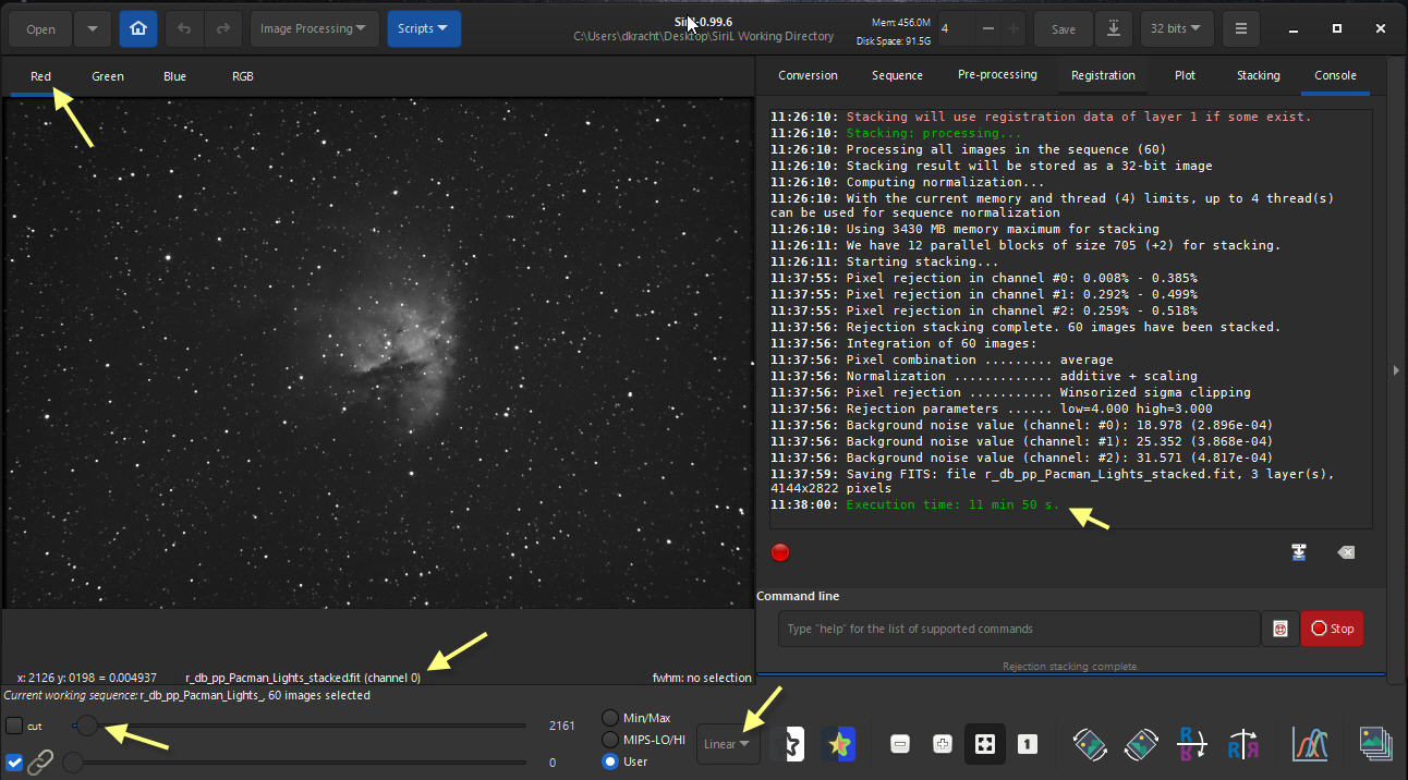 - Output: Ergebnisdatei r_db_pp_Pacman_Lights_stacked.fit im Arbeitsordner (diese wird im SiriL-Fenster gleich angezeigt)