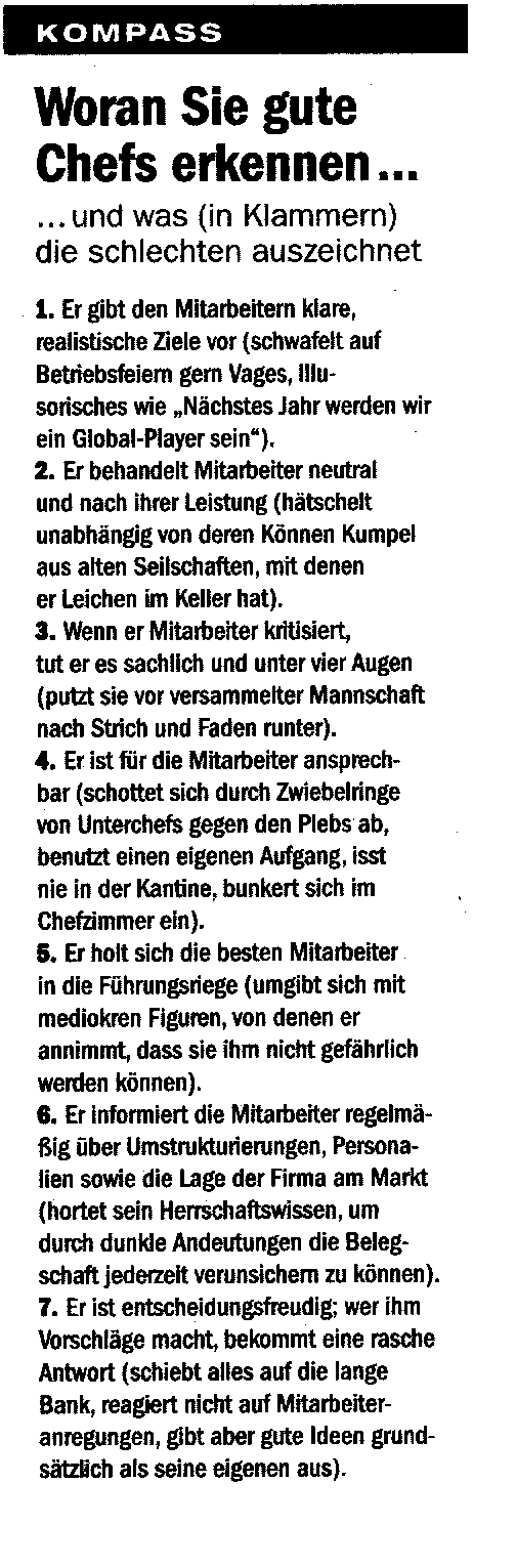 In einem Seitenkasten (rechts) werden sieben Eigenschaften genannt, die gute Führungskräfte auszeichnen – und sieben Eigenschaften, die schlechte Chefs auszeichnen.