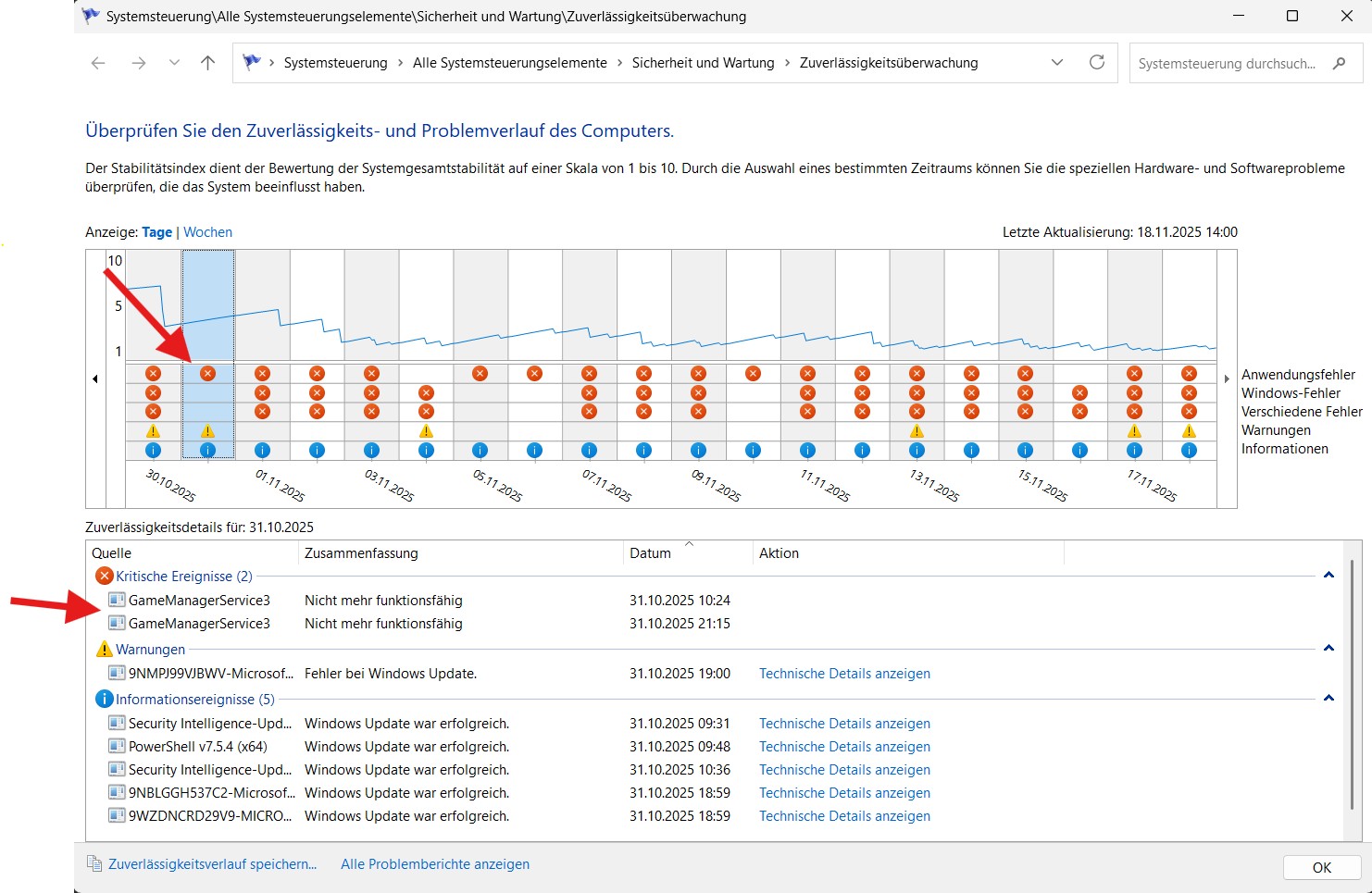 - Gib in der Windowssuche: Zuverlässigkeitsverlauf anzeigen ein und schau bei den roten Kreisen mit weißen x die Fehlermeldung nach.