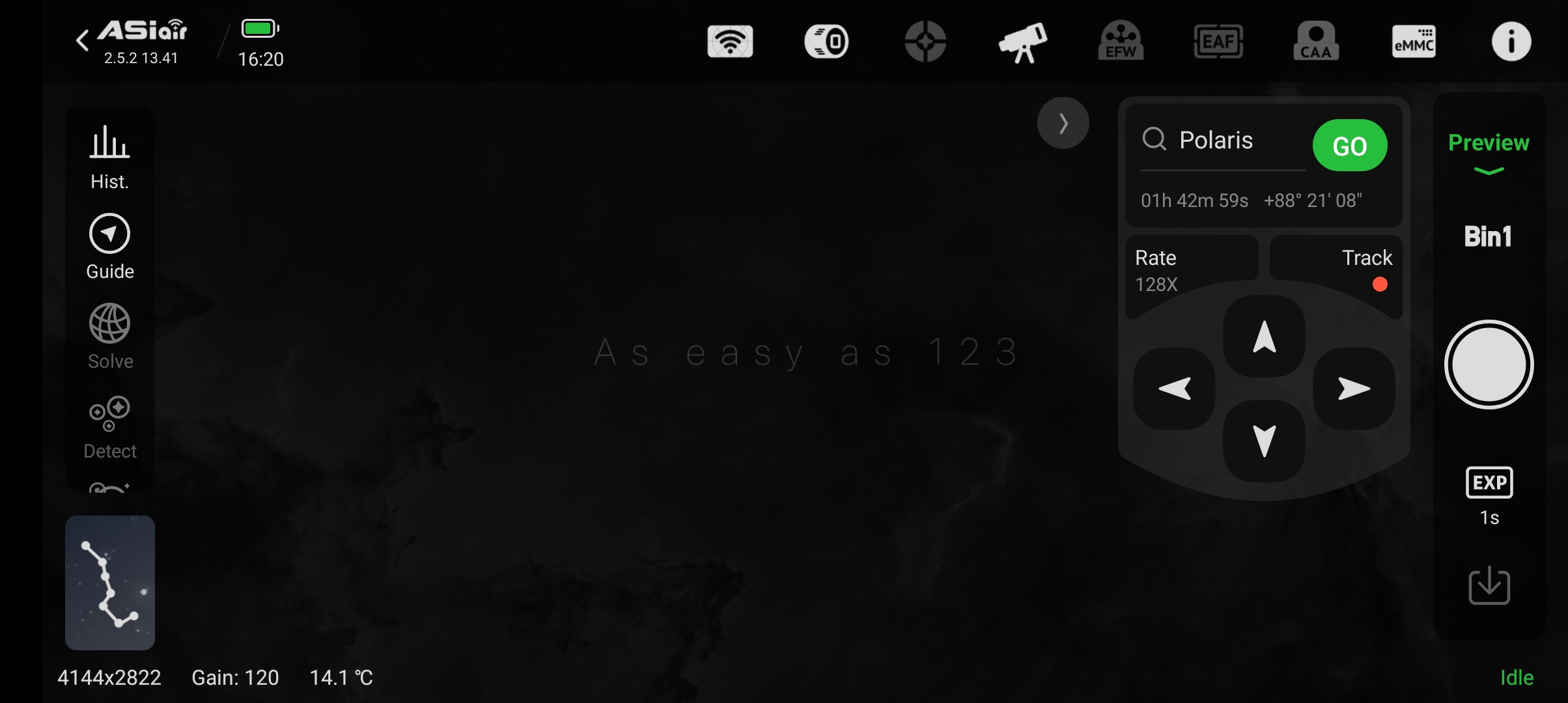 Nachdem die Montierung mit Optik, Kamera und ASAIR aufgestellt ist, es dunkel genug geworden ist und durch Fokussieren nun mehrere Sterne im Gesichtsfeld zu sehen sind, sollte das Plate Solving der ASIAIR Plus ausprobiert werden.