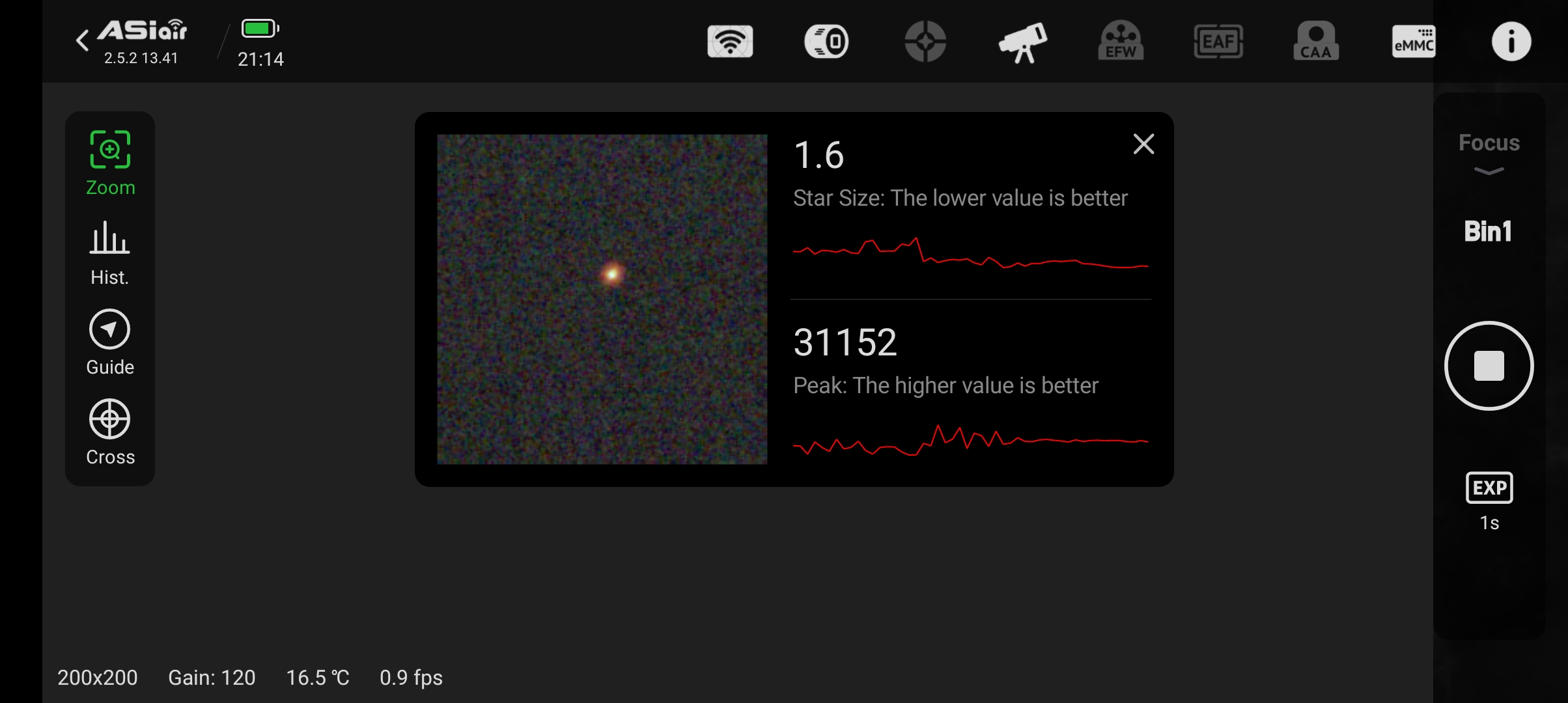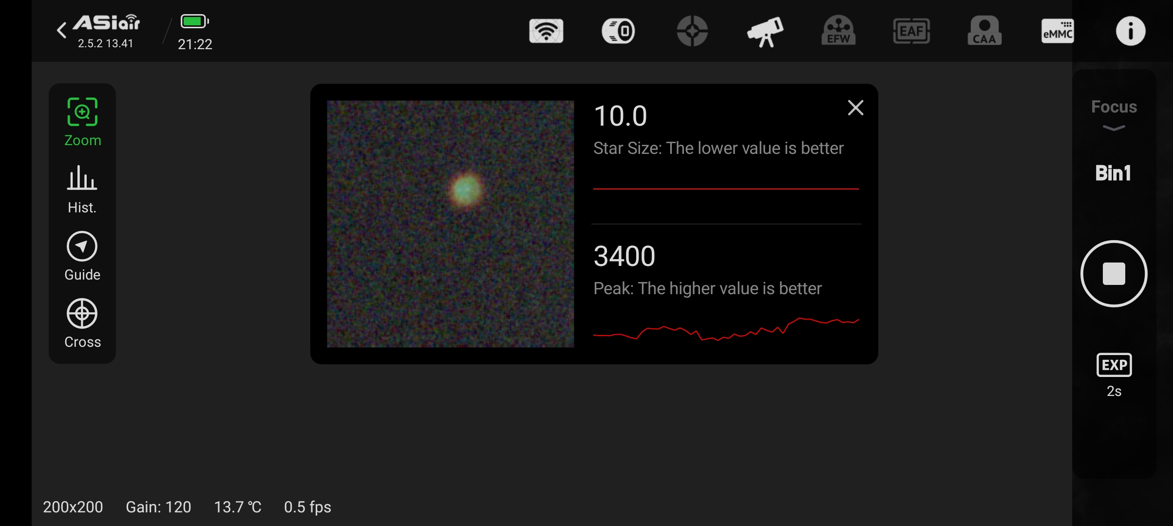 - Wechseln in den ASIAIR-Modus “Focus”. Belichtungszeit einstellen (z.B. 2 sec)